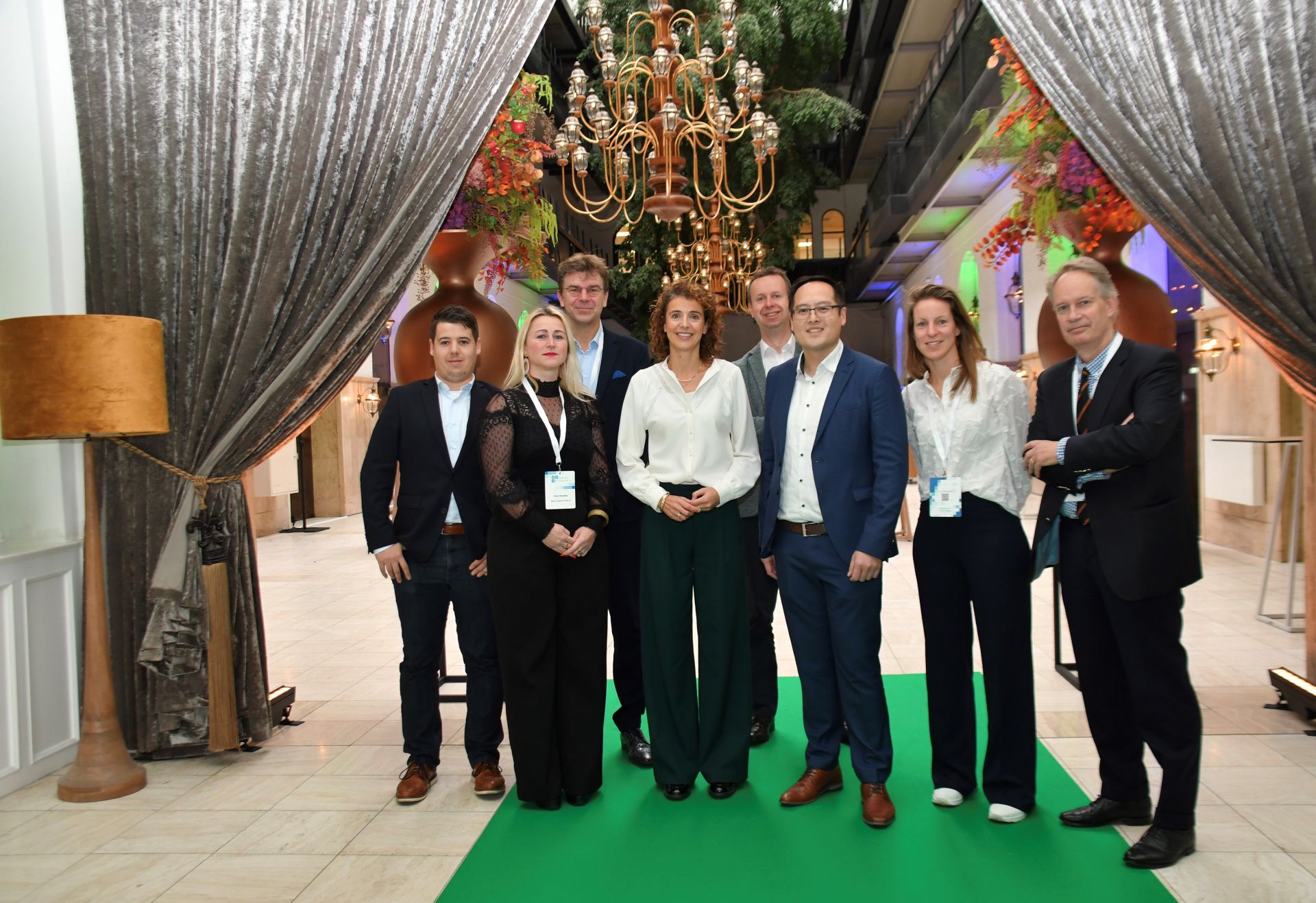 From left to right: Dries Kreuskens (Elestor), Elena Sbenghea (BCC-NL), Guido Mul (Universiteit Twente), Minister Hermans (KGG), Wiebrand Kout (Elestor), Jiajun Cen (AQUABATTERY), Janneke Tjon Pian Gi (AQUABATTERY), Ben van Vulpen (Exergy Storage). (© Mathias de Graag / RVO)